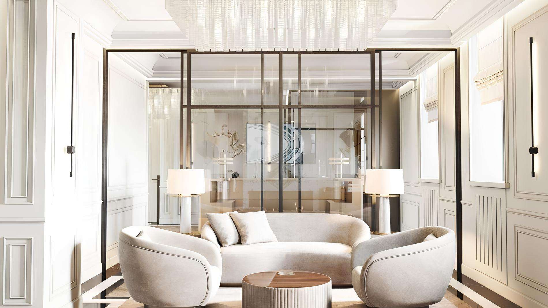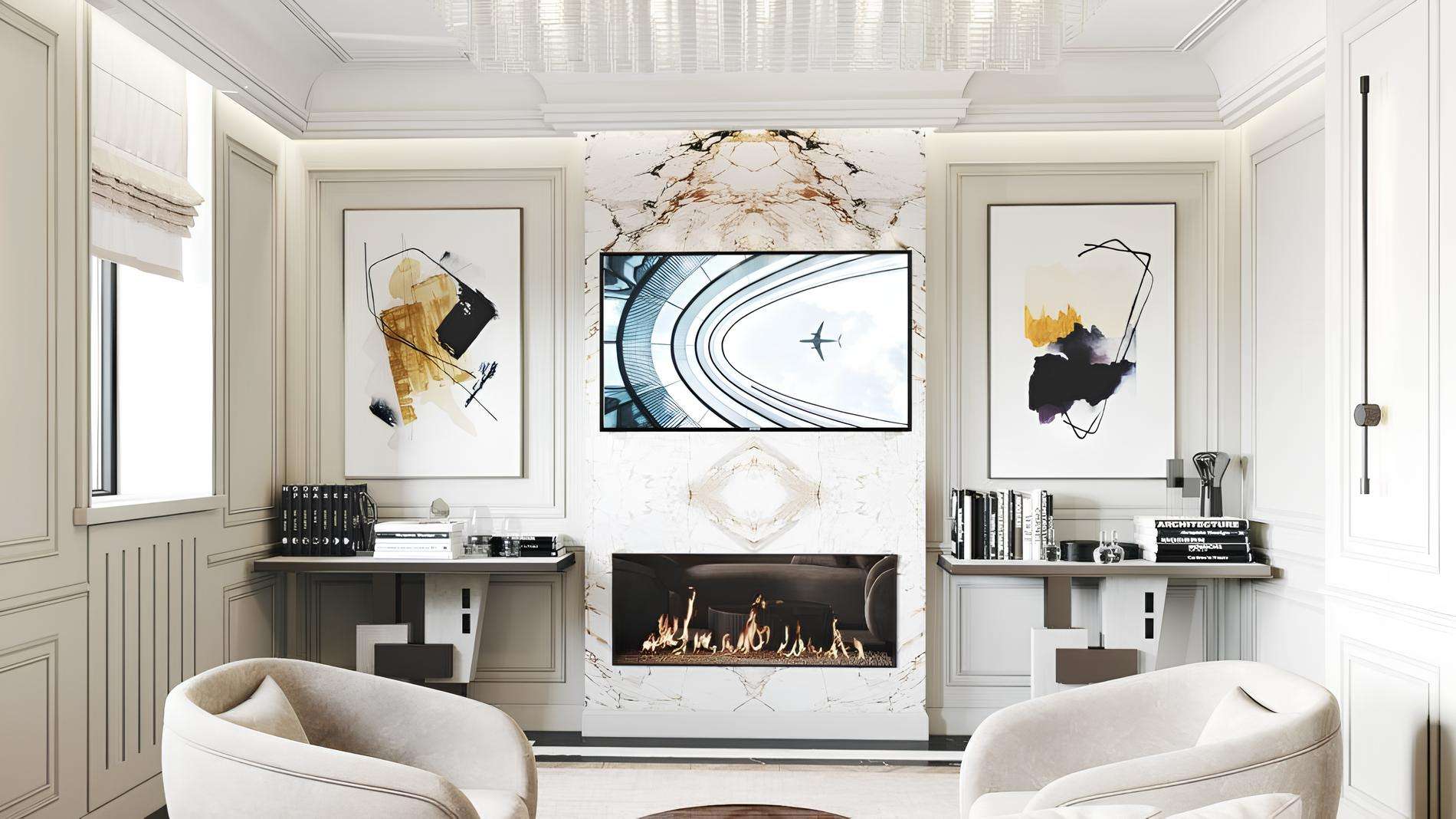 Центральным элементом интерьера становится ослепительная хрустальная люстра, наполняющая помещение особенным блеском и светом. Здесь обустроена приватная лаунж-зона с камином, предназначенная для отдыха или неформальных деловых встреч.