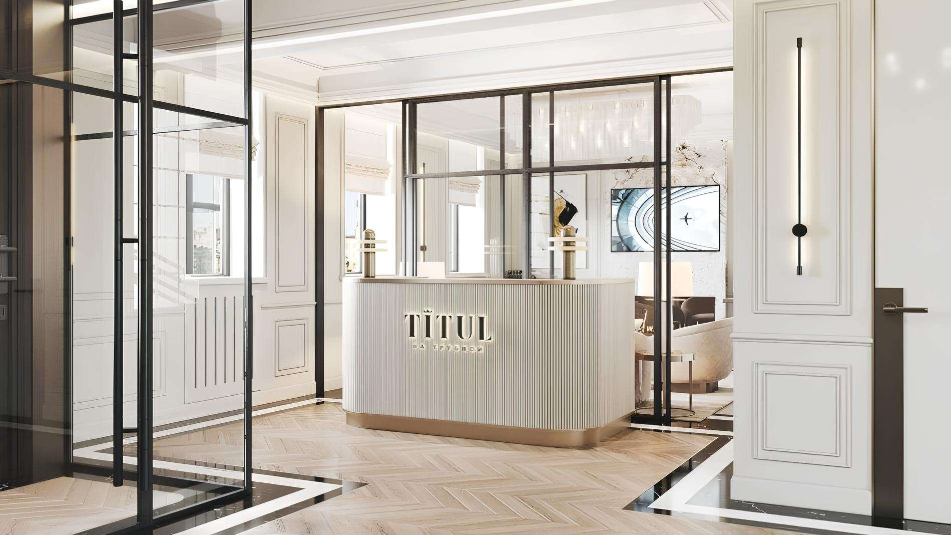 Переступая порог «TITUL на Трубной», вы попадаете в атмосферу утонченной роскоши и гостеприимства. Пространство лобби встречает гостей и жителей отделкой из натурального мрамора, декорированной латунными вставками и гипсовой лепниной.