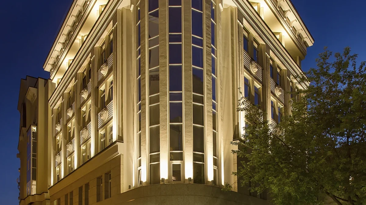 Фасад облицован натуральным камнем и дополнен декоративными барельефами львов. Архитектура дома подчёркивает его статус – камерный, утончённый и вневременной.