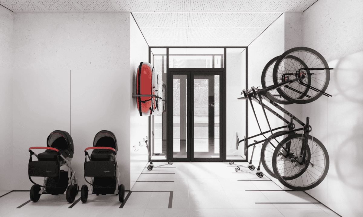 Входные группы корпусов оформлены в единой концепции с акцентом на комфорт, стиль и цифровую навигацию. В каждом лобби предусмотрены зоны ожидания, места для хранения колясок, лапомойки для домашних питомцев.