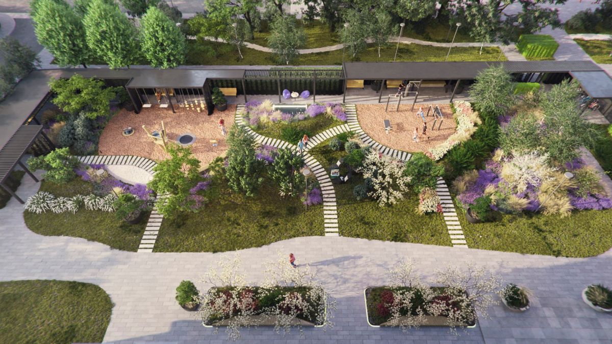 - лужайки, водные элементы, зоны для отдыха и площадка для выгула собак.