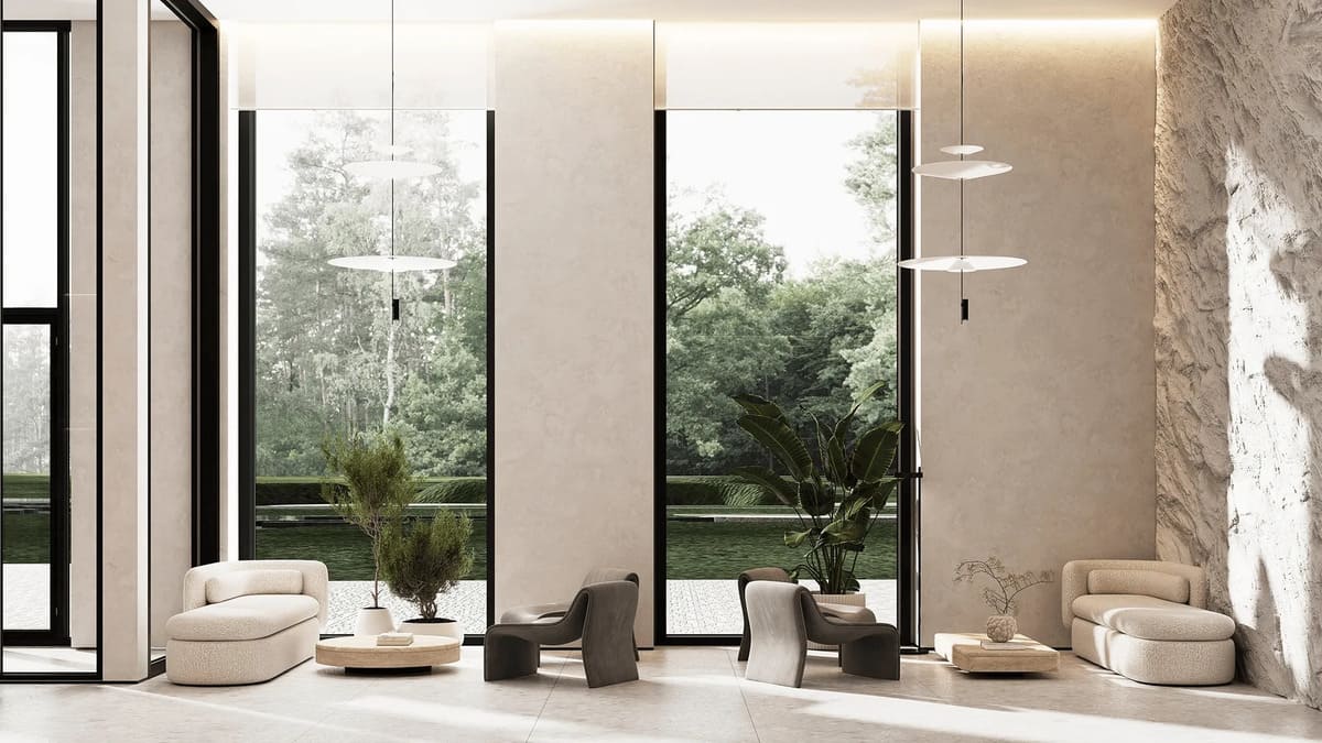 Внутреннее пространство оформлено в едином ключе: природные цвета, мягкие линии, современные материалы. От холлов до ландшафтных решений – в проекте читается лаконичная элегантность и внимание к каждой детали.