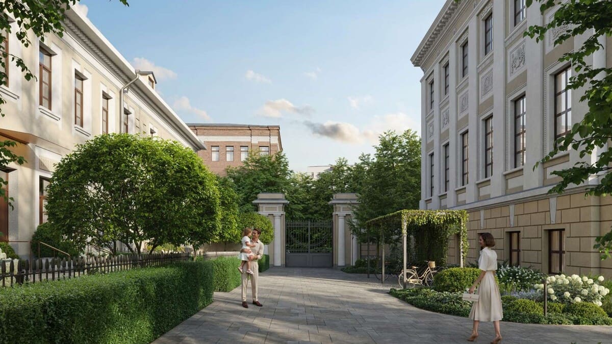 Проект представляет собой масштабную реставрацию исторического памятника архитектуры, в рамках которой бережно воссозданы фасады главного дома и флигелей, а также возведены современные корпуса высотой до 11 этажей.