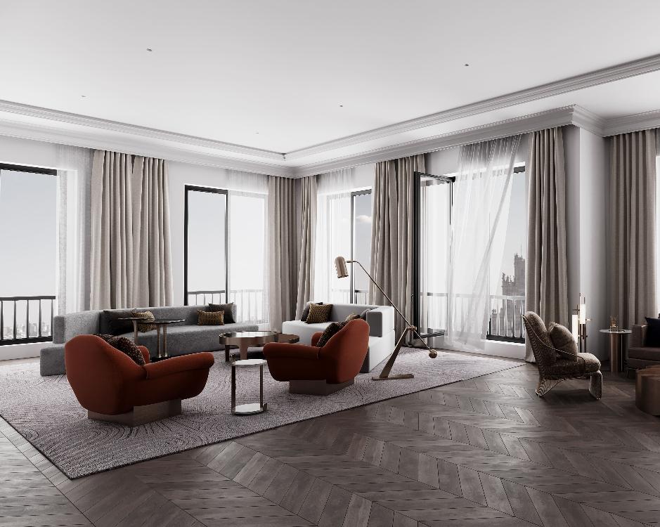 Жилые резиденции полностью укомплектованы для комфортного проживания. В апартаментах установлена эксклюзивная мебель, светильники и аксессуары, созданные по индивидуальным эскизам, а также оснащенные кухни и ванные комнаты.