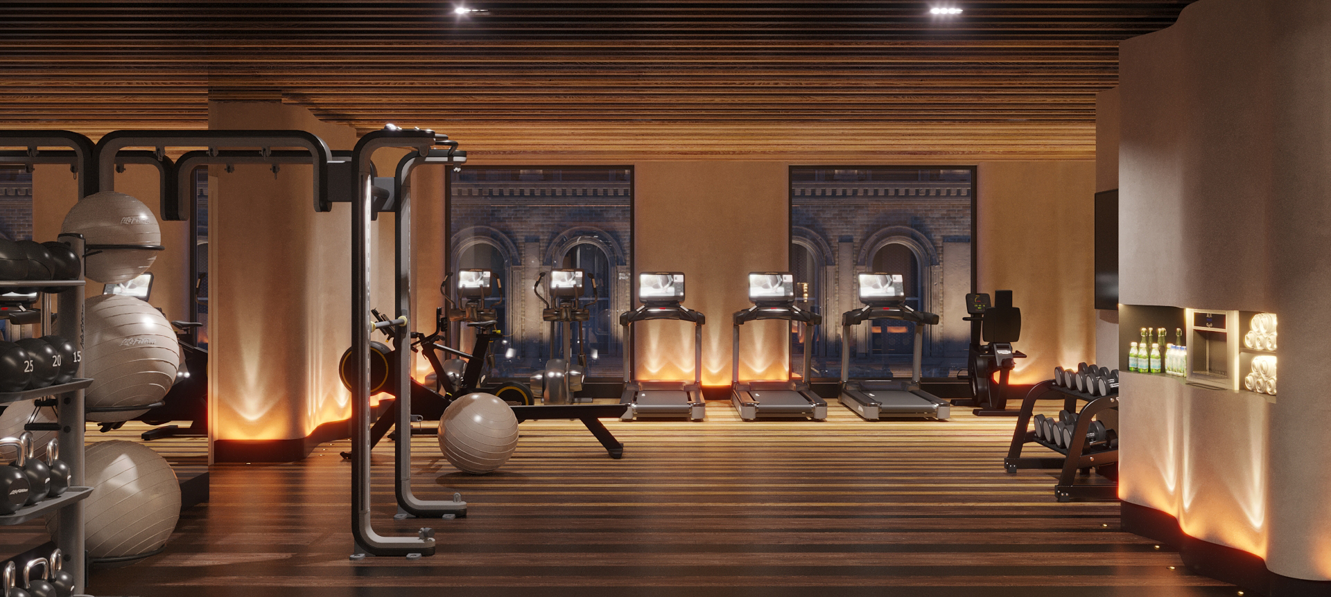 Фитнес-центр с современным оборудованием, беговые дорожки с панорамными видами на Москву.