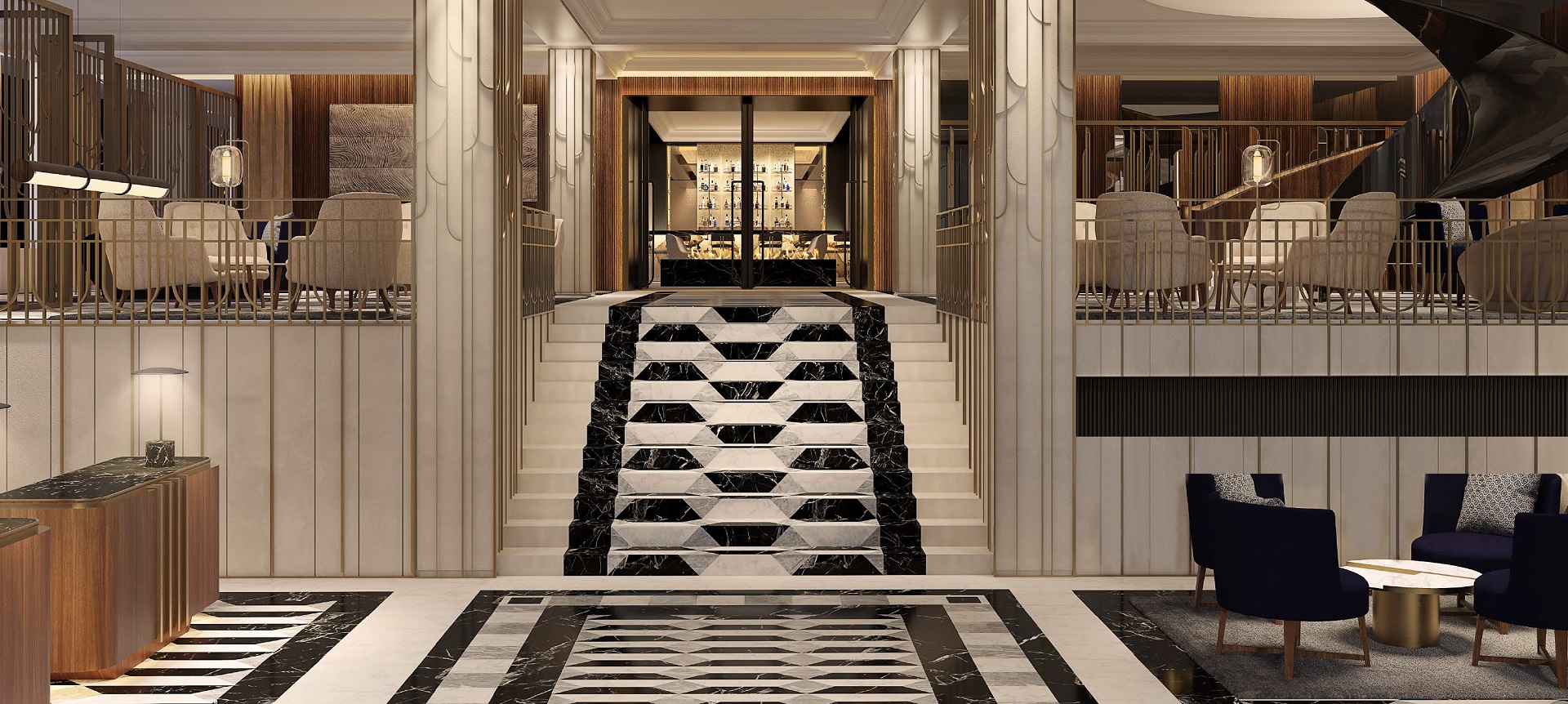 Просторное лобби оформлено в сдержанных теплых тонах. Контраст темного и светлого мрамора на полу подчеркивает геометрию элементов из матового стекла и золотистого металла, зонирующих лобби и lounge-пространство