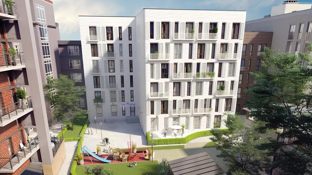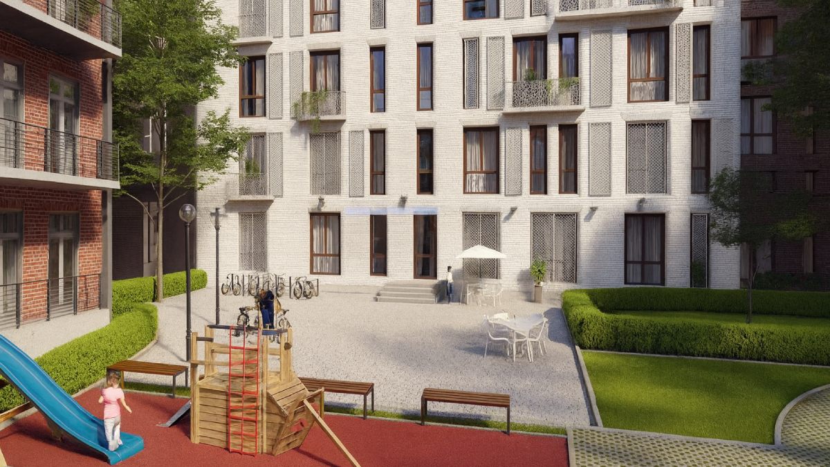 Внутренний двор оформлен как зона отдыха и прогулок с ландшафтным дизайном, здесь же расположена современная детская площадка.