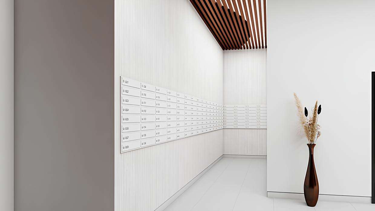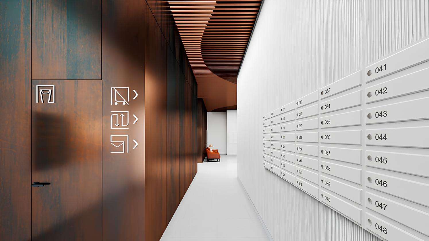 Высокие потолки, достигающие семи метров, и мягкое освещение создают ощущение простора и торжественности. Цветовые решения меняются от корпуса к корпусу, отражая их названия — здесь присутствуют благородные оттенки лазурного, морской волны, индиго и сапфира. Пространство функционально зонировано и включает стойку ресепшн с круглосуточным консьерж-сервисом, зоны ожидания с диванами и Wi-Fi, а также почтовые комнаты.