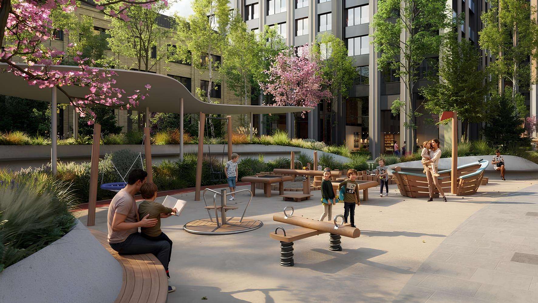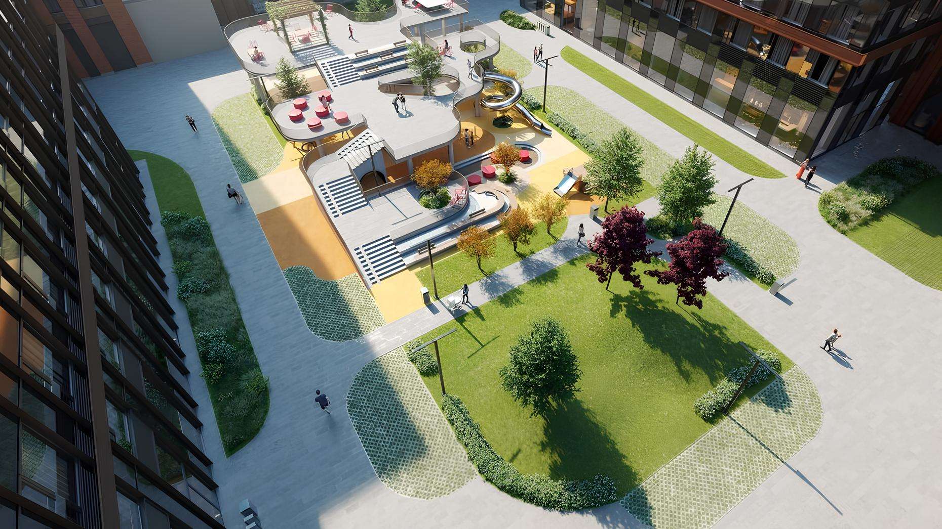 Через весь квартал проходит прогулочный бульвар с аллеями, скамейками, перголами и площадками для общественных мероприятий. Для спорта и активного отдыха оборудованы площадки с турниками, теннисный стол и подвесные кресла-качели.