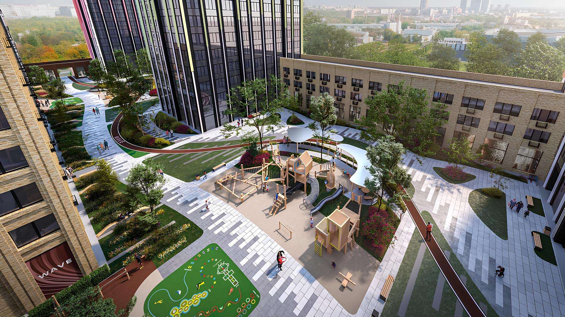 Дворовое пространство «Wave» представляет собой многофункциональное арт-пространство, полностью свободное от машин. В первой очереди двор решён в два уровня: на нижнем расположатся уютный сад, детские площадки с песочницами и скалодромом, а на верхнем — мини-амфитеатр, коворкинг и открытая беседка.