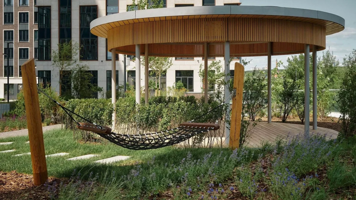 - многочисленными зонами отдыха с беседками, шезлонгами, качелями, гамаками и скамейками,
