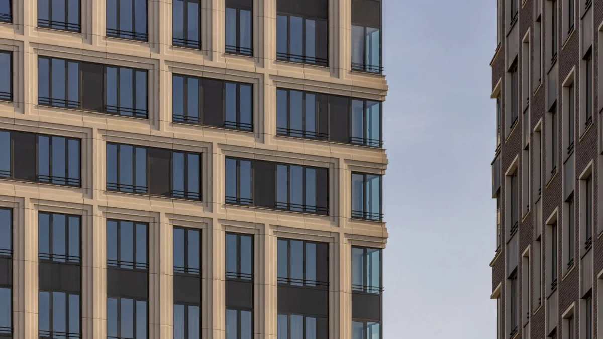 Входные группы проекта включают два просторных центральных лобби с потолками высотой 7,8 м, которые продолжают элегантный стиль фасадов.