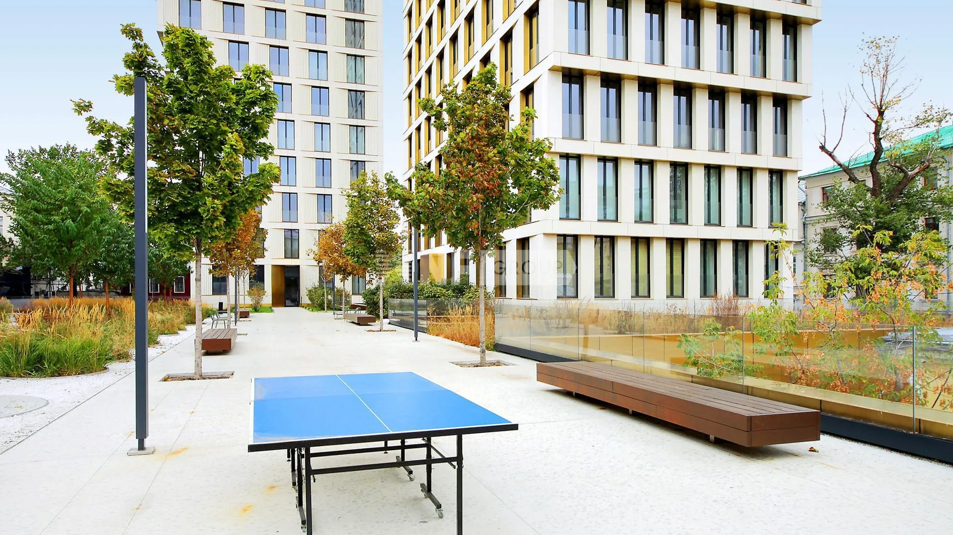 Внутренний двор комплекса представляет собой уединенное пространство, полностью свободный от машин и доступный только для его жителей.