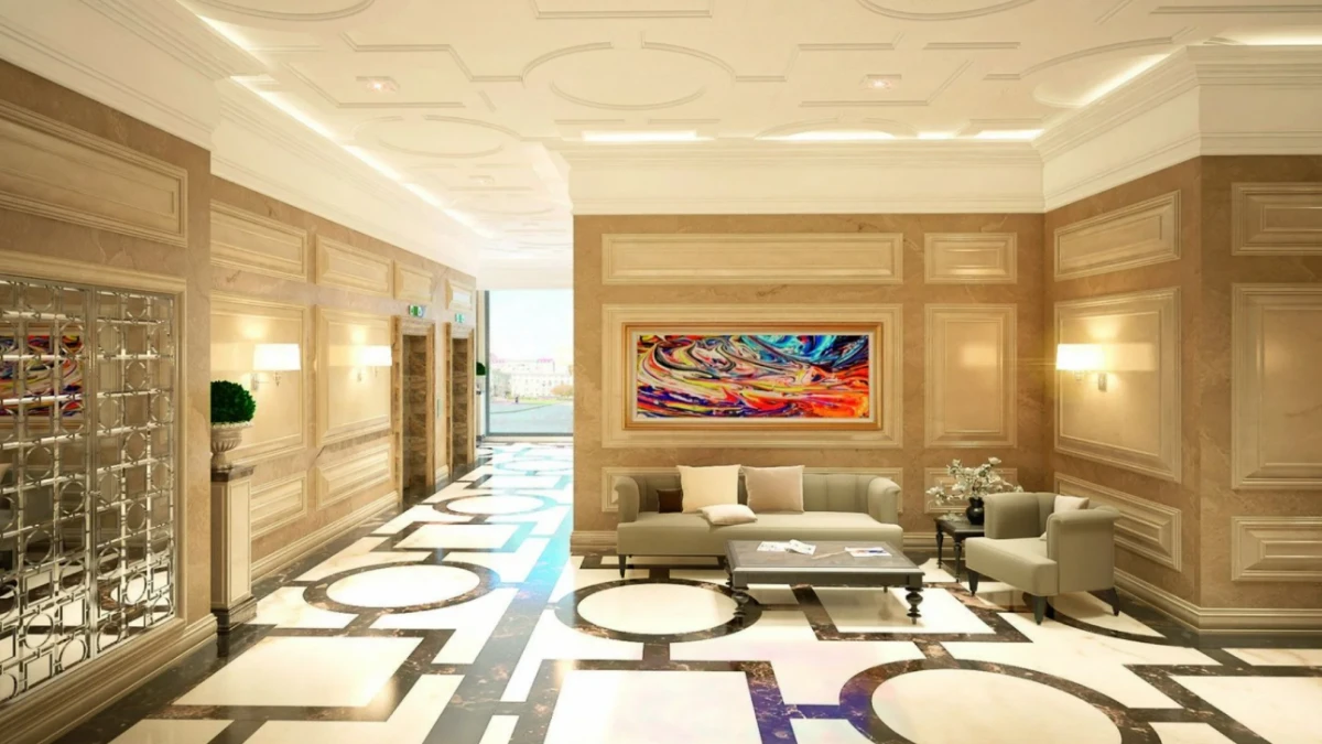 Лобби ЖК «Жизнь на Плющихе» выполнено в американском ар-деко: мраморные полы с орнаментом, зеркальные панели с гравировкой, почтовые ящики из шпона. Премиальные лифты Kleemann – с авторской отделкой и подачей на нужный этаж.