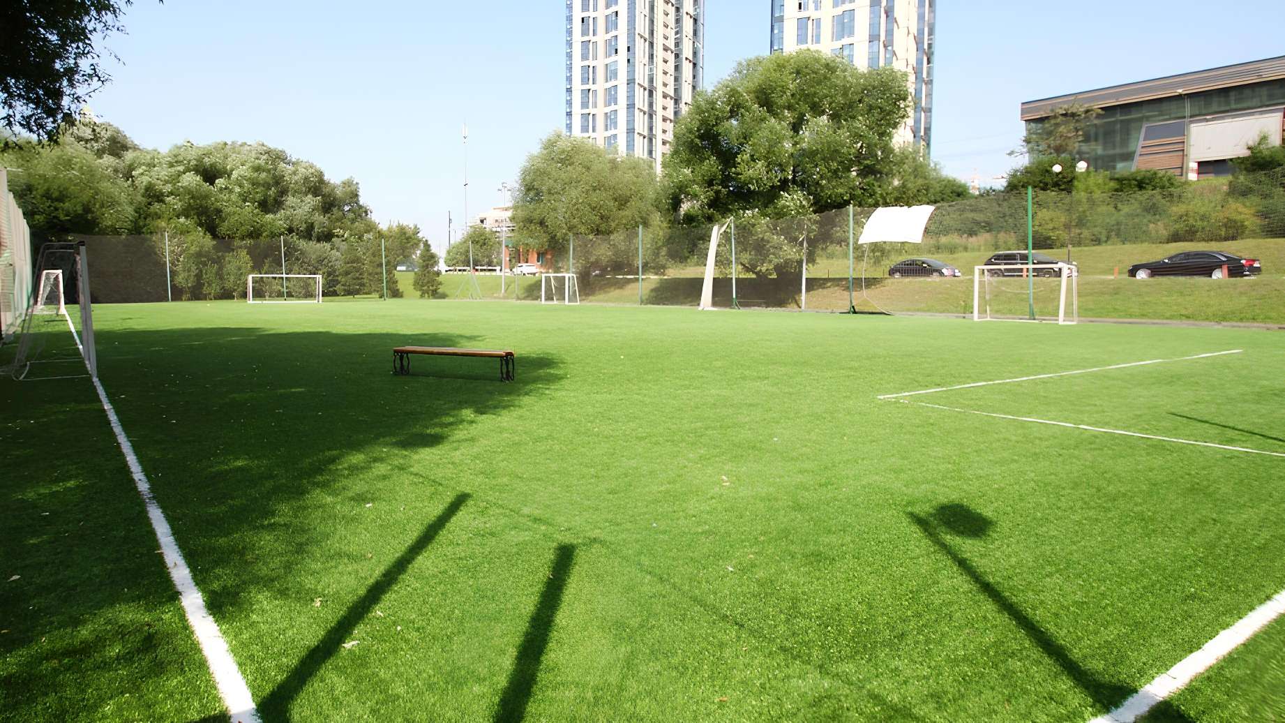 Для активного отдыха во дворе оборудованы современные спортивные площадки, а также безопасные, огороженные детские игровые городки с качелями и горками. Уникальной особенностью комплекса является собственный мини-зоопарк, где живут ламы, маралы и водоплавающие птицы, что делает прогулки особенно интересными для детей. Повсюду расставлены скамейки и малые архитектурные формы, превращающие двор в идеальное место для спокойного отдыха.
