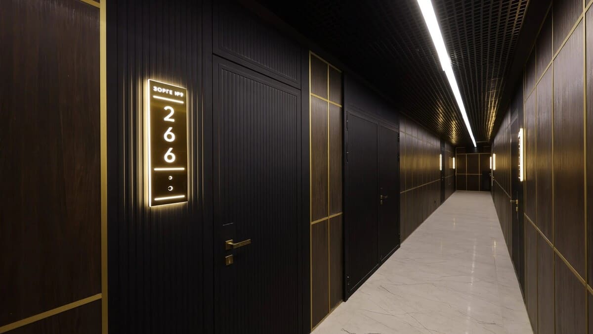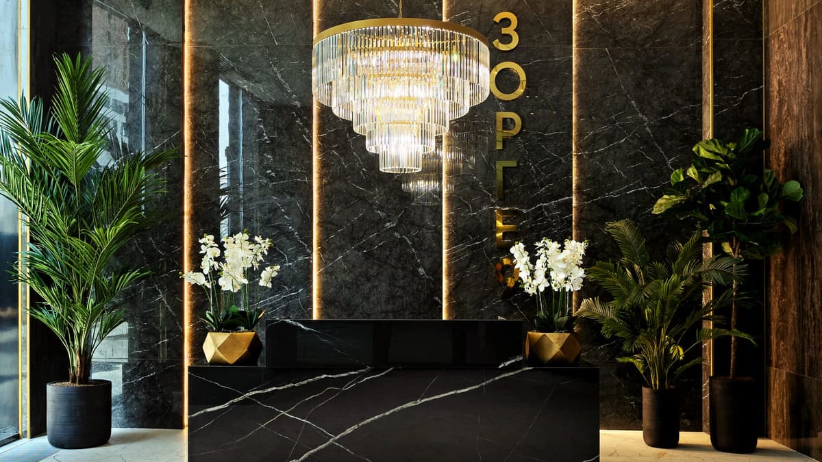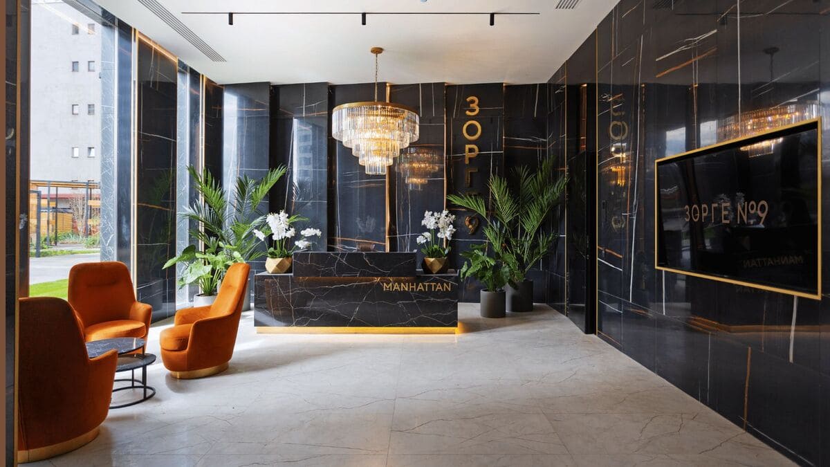 Каждый корпус Зорге 9 встречает своих гостей просторным и изысканным лобби в стиле премиального отеля. Интерьеры оформлены с использованием натуральных материалов, дополнены дизайнерской мебелью и современными арт-объектами.