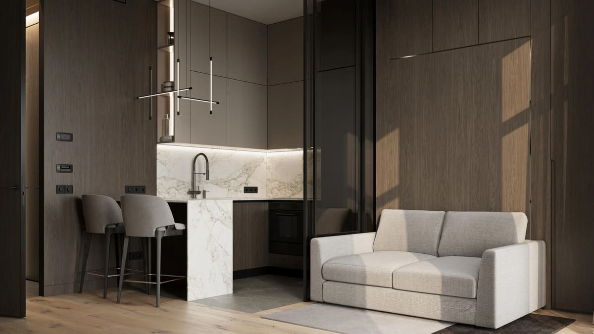 Каждое пространство продумано до мелочей: французские балконы, свободные планировки, угловое остекление и высокие потолки от 3,15 до 4,15 м. Площади варьируются от 27 до 81 м², а пентхаусы достигают 150 м² и выше.